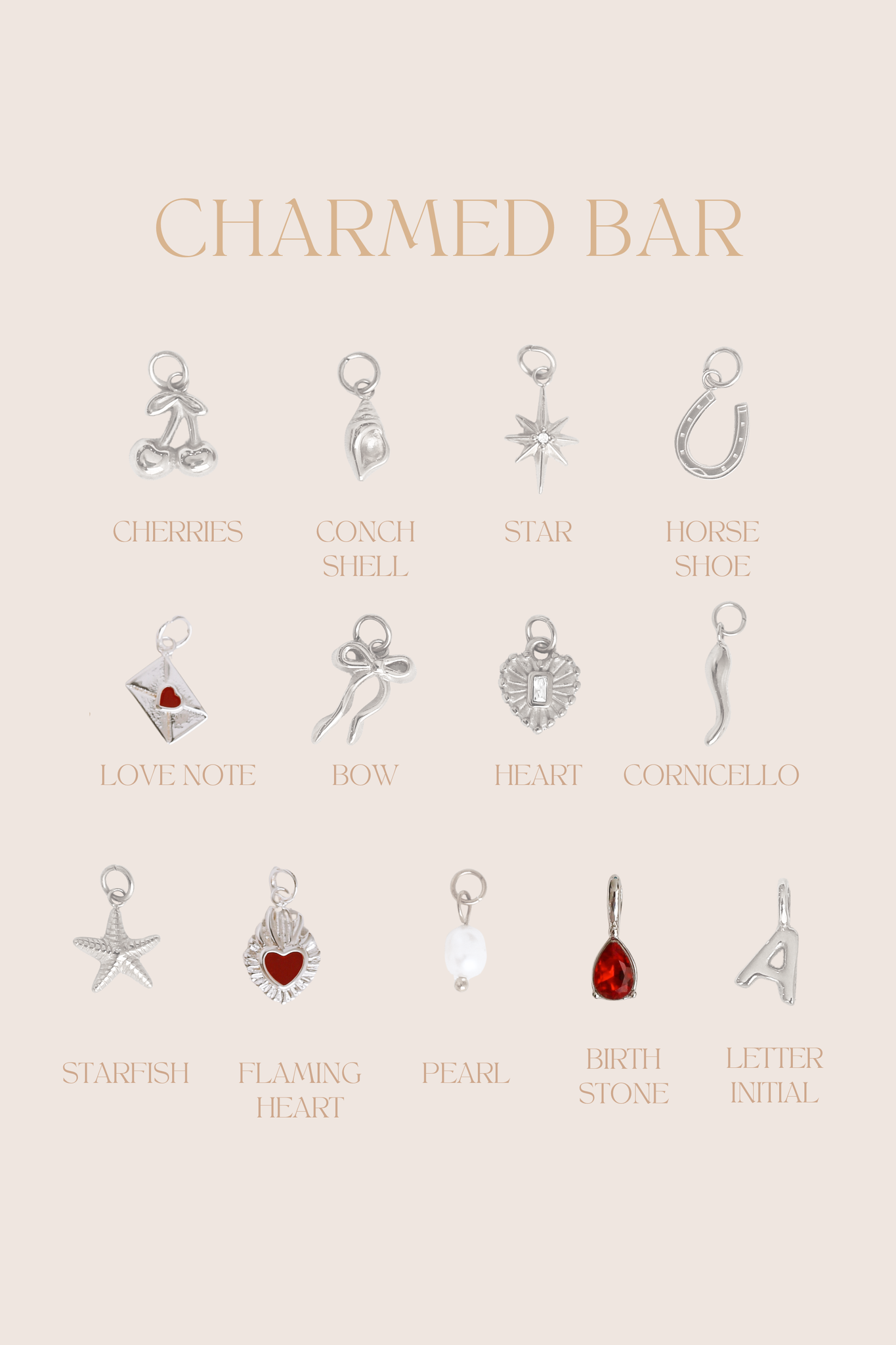 - When choosing charms please write the charm name in order of how you would like it located left to right.